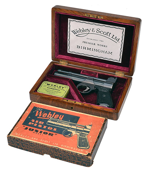 circa 1957, with blued 6in. barrel, blued air-chamber, cast frame and grip, chequered black plastic grips, much original finish with slight storage marks; TOGETHER WITH its manufacturers card carton with red label and 'crocodile effect' box-sides also in fine condition and a wood storage case compartmented and lined in purple velvet, reproduction trade label to inside lid nd containing a '500' size green rectangular tin of Webley 'SPECIAL PELLETS' (fine condition, some contents)