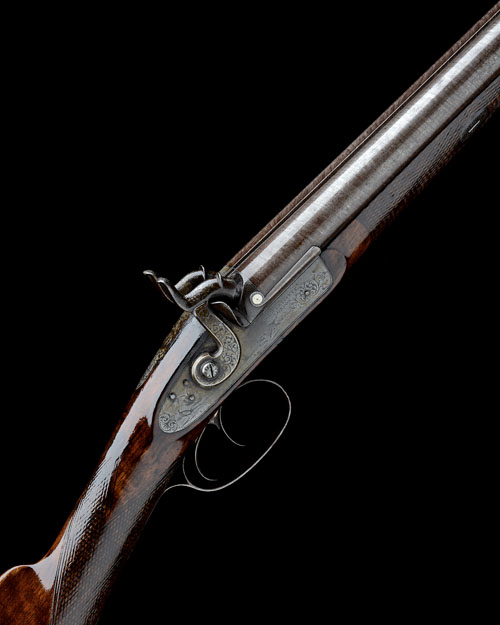 A 14-BORE PERCUSSION DOUBLE-BARRELLED SPORTING-GUN, no visible serial number,