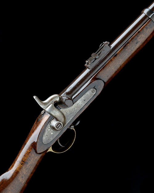 dated for 1858, with 39in. barrel (some mild pitting to the exterior), block and blade fore-sight, elevating ladder rear-sight, borderline engraved lock signed 'TOWER' together with the date and a crown over 'VR' device to the tail, walnut three-quarter stock, brass furniture, three iron barrel-bands and jag-ended iron ramrod