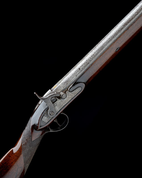 circa 1825 with later conversion to percussion by drum and nipple, with twist iron 60in. barrel, bead fore-sight, short flat sighting plane at breech with inlet gold poincon signed 'I. Hart HENLEY' in raised letters, deep sighting groove to the plain top-tang, bevel-edged slightly curved lock with stepped pointed tail (traces of engraving, detail obscured), walnut half-stock chequered at the wrist, iron furniture, multiple piece under-barrel rib (detaching in places) originally with three thimbles (two detached, one missing) and iron ramrod