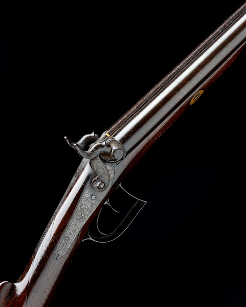 A 16-BORE PERCUSSION DOUBLE-BARRELLED SPORTING-GUN, no visible serial number,