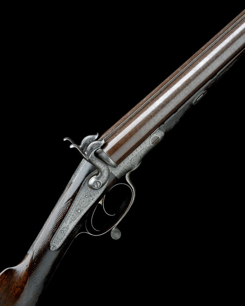 circa 1870, with fine damascus 30in. barrels, the top-rib signed in script 'PARKER FIELD & SONS, MAKERS TO HER MAJESTY, 255 HOLBORN, LONDON', bead fore-sight, scroll engraving to the rib-end at breech, long scroll engraved top-tang, carved hammer-nose wells, border and scroll engraved back-action locks signed 'PARKER FIELD & SONS', walnut butt-stock chequered at the wrist, iron furniture, scroll engraved swing under-lever, scroll engraved rounded action body and walnut chequered splinter fore-end with horn tip