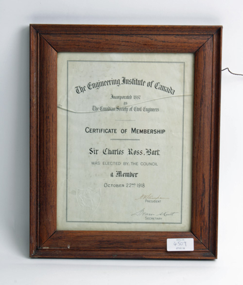 A RARE FRAMED CERTIFICATE OF MEMBERSHIP PRESENTED TO SIR CHARLES ROSS, presented by The Engineering Institute of Canada on October 22nd 1918 and displayed in a wooden frame. Sir Charles Ross was the inventor of