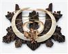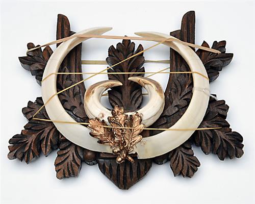 A SET OF GOLD MEDAL MOUNTED WILD BOAR TUSKS, mounted on a carved shield, with gold medal