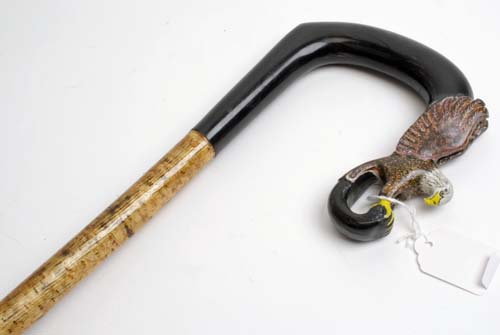 A CARVED SHEPPARD CROOK, with ash staff, brass ferrule, crook with a carved bold eagle