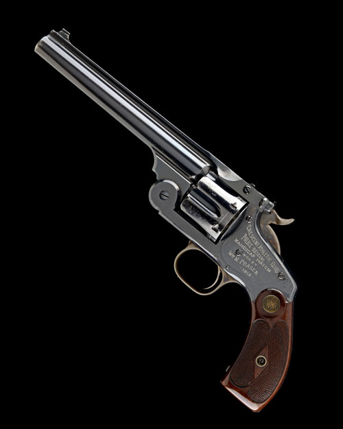 circa 1895 but dated 1919, with blued 6 1/2in. barrel, the sighting rib signed and marked with patent dates to 1871, blade and bead fore-sight, drift adjustable rear-sight, break-open frame with automatic ejection, blued fluted cylinder, blued frame, the side-plate inscribed 'CRESCENT ATHLETIC CLUB POLICE RESERVE HANDICAP MATCH. WON BY WM. N. FRASER, 1919', colour-hardened hammer and trigger-guard bow, chequered rosewood grips with inlaid 'S&W' roundels, the whole retaining most of its original blued finish and appearing little used