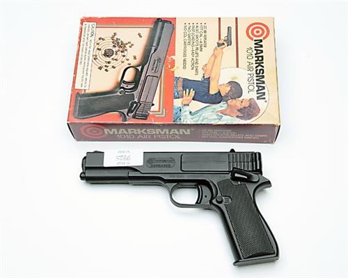 ** A BOXED .177 REPEATING (ON BB), SLIDE-COCKING AIR-PISTOL SIGNED MARKSMAN, MODEL '1010', serial no. 1E14, circa 1975, with 2 1/2in. flip-op barrel, black painted receiver and slide, integral chequered grip, the whole appearing little used AND COMPLETE with its makers polystyrene carton with printed card lid and instructions