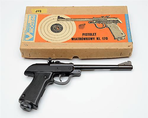 ** A BOXED .177 BARREL-COCKING AIR-PISTOL SIGNED PREDOM LUCZNIK, MODEL 170, serial no. Z6200, for 1975, with 9in. sighted barrel, black receiver, black chequered plastic grips, the whole appearing unused; COMPLETE WITH its makers card carton and cleaning rod