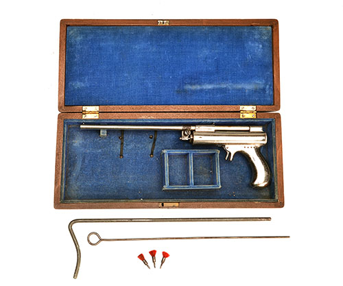 circa 1876, with nickel-plated pull-out 11in. barrel, pillar fore-sight, standing notch rear-sight on the barrel support, blued cocking linkage piece, cast nickel-plated air-chamber with integral semi-birdshead grip, the end-cap marked 'POPE BROS. USA' in the centre and various international patents around the circumference, much original nickel-plating remaining; TOGETHER WITH its original rounded corner walnut storage case, the interior lined and compartmented in blue velvet containing the pistol along with its wire shoulder-stock and cleaning rod, two compartments for pellets and darts and two elastic loops (perished)