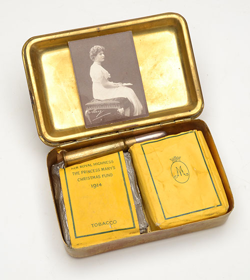 given out to the Officers and men at Christmas 1914 in a choice of two types, one containing chocolate, the other tobacco as represented here, the tin embossed with a portrait of Princess Mary together with the names of various allied nations, the inside containing a photograph of the Princess together with a .303 cartridge case engraved with her monogram and fitted with a silver bullet sliding out to reveal a pencil, a pack of un-filtered cigarettes (opened, one missing), and a pack of rolling tobacco (some damage and slight loss to contents), missing the original greeting card, the tin in fine unpolished condition