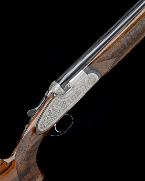 27 7/8in. nitro barrels with tapered ventilated matt top-rib, 2 3/4in. chambers, bored approx. 1/2 and 3/4 choke, hold-open toplever, manual safety, bold floral and scroll engraving, bright finish, 14 3/8in. figured pistolgrip stock (with applied gel cheekpiece) including 1/2in. rubber recoil pad, weight 7lb. 13oz., in its leather and cloth bound case
