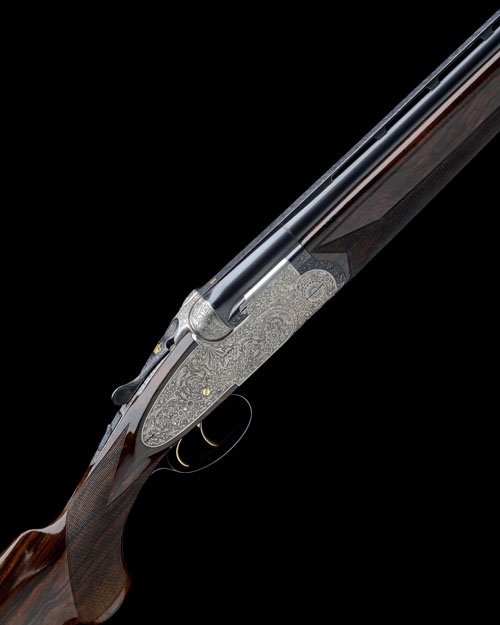 28 3/8in. (72cm) nitro barrels with tapered ventilated matt top-rib, gold-inlaid at the breech end 'II', 2 3/4in. chambers, bored approx. 1/2 and 3/4 choke, hold-open toplever gold-inlaid with a crown, manual safety, gold-washed cocking-indicators, gold-washed triggers, the front articulated, the action, lockplates and furniture carved in low relief with flowing floral and acanthus motifs on a matted background, the triggerplate signed 'S. TONONCELLI', the triggerguard gold-inlaid 'II' in a shield, bright and blued finish overall, 14 3/8in. figured pistolgrip stock with fluted pistolgrip-cap, sling eyes and including 1/2in. rubber recoil pad, weight 7lb. 5oz., in a universal case