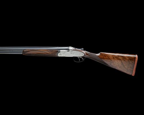 28 7/8in. nitro barrels with tapered raised matt rib, gold-inlaid '1' at the breech end, 2 3/4in. chambers, bored approx. 3/4 and full choke, hold-open toplever gold-inlaid '1', manual safety, cocking-indicators, profuse engraving of fine acanthus scrollwork interspersed with scrolling floral motifs, bright and blued finish overall, 14 1/8in. figured stock including 5/8in. rubber recoil pad, weight 7lb. 5oz.