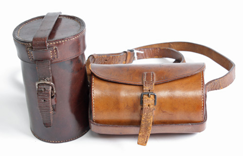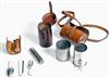 in 'British Plate' with bone handles, comprising knife, four-prong fork and spoon (the fork incorporating a corkscrew) with matching salt and pepper shakers, contained within a soft leather pouch, together with a plated spirit kettle comprising two beakers, fuel element and gauze and conical container for the fuel oil, both items are housed in their hard leather travelling cases