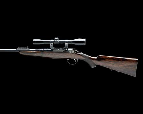 26in. nitro barrel engraved 'GEORGE GIBBS. BRISTOL & 35 SAVILE ROW. LONDON. W.', open sights with four folding leaf sights for 100, 200, 300, 400 and 500 yards, block-mounted bead fore-sight, receiver mounted with a Kassnar Beta 3 4x32 telescopic sight on a quickly-detachable side-rail, detachable box magazine, hollowed round bolt handle, boldly-figured pistolgrip stock with steel pistolgrip-cap and buttplate, sling eyes, 14 1/4in. pull