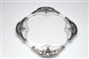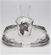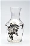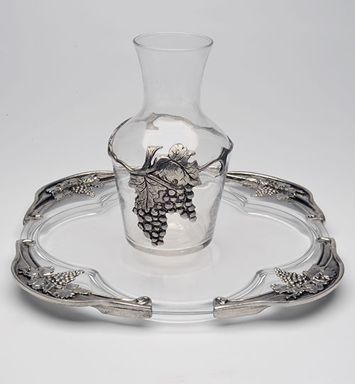 A DECORATIVE CARAFE AND GLASS SERVING TRAY, both the caraf and edges of the four leaf clover shaped tray heavily decorated with grapes , the metal worked stamped 95% etain