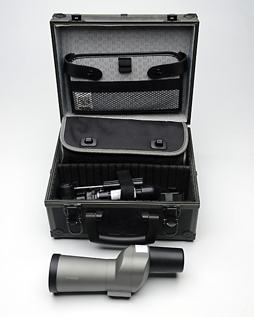 A CASED 12-50x50 BENCH-STANDING SPOTTING SCOPE SIGNED CENTON, with soft carry-case, lens covers, table-top tripod and its Maker's aluminium banded storage case, the whole appearing little used