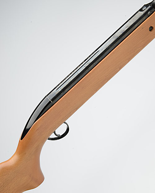 A .22 UNDER-LEVER COCKING AIR-RIFLE SIGNED BSA, MODEL AIRSPORTER, serial no. GI8065, for between 1969-71, with blued 18 1/2in. barrel (rear-sight missing), plain air-chamber, enamelled trigger group and pale beech half-stock with concealed under-lever in the fore-end, collectable external condition
