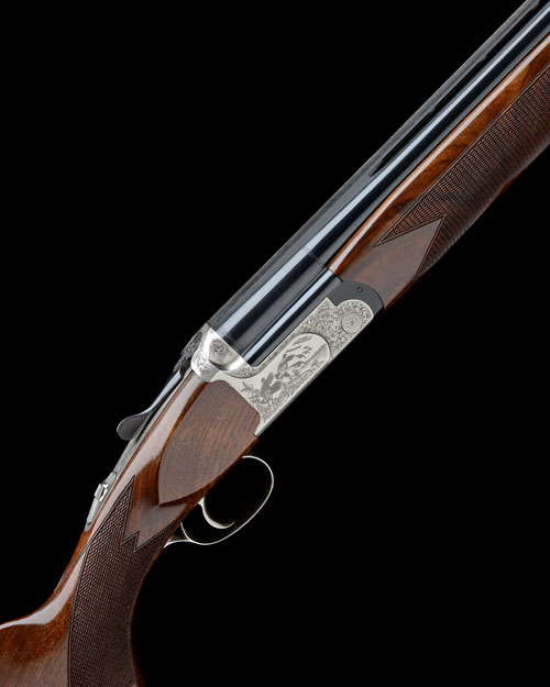 28in. nitro barrels with 10mm ventilated matt top-rib and ventilated mid-rib, 3in. chambers, multi chokes (no spares), hold-open toplever, manual safety with integral barrel selector switch, game and scroll engraving, bright finish, 14 3/8in. figured pistolgrip stock including wooden buttplate, weight 7lb. 3oz.