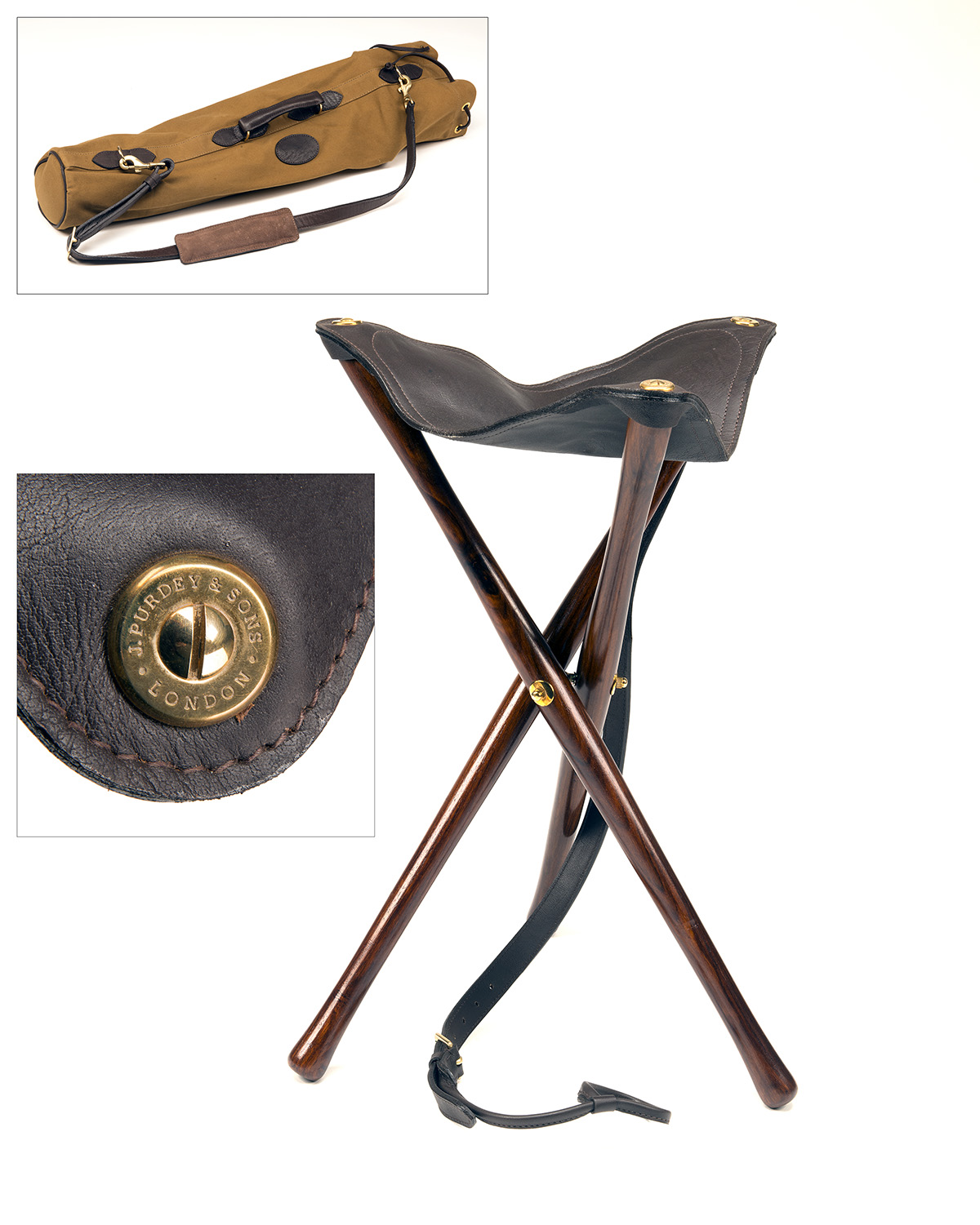 JAMES PURDEY & SONS A NEW AND UNUSED LIGHTWEIGHT WOOD AND LEATHER TRIPOD SEAT,
