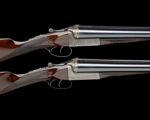 serial numbers on fore-end woods only, 30in. nitro barrels (No.1 reproved), ribs engraved 'H. E. AKRILL. BEVERLEY', and gold-inlaid '1' and '2' at the breech ends, 2 1/2in. chambers, bored approx. 1/4 and full choke (No.1) and imp. cyl. and 3/4 choke (No.2), treble-grip actions with hidden third bites, fences finely craved in relief with stylised acanthus leaves, toplevers gold-inlaid '1' and '2', automatic safeties with gold-inlaid 'SAFE' details, fine acanthus scroll engraving with floral bordering, No.1 retaining very slight traces of original colour-hardening and some renewed finish, No.2 retaining some original colour-hardening and finish, 14 1/8in. well-figured stock including buttplate (No.1) and 15 3/4in. stock including 2in. wooden extension (No.2), weight 6lb. 5oz. (No.1) and 6lb. 9oz. (No.2), in brass-cornered oak-lined leather case with H. Esau Akrill trade label