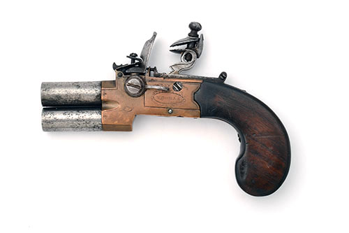 AN 80-BORE FLINTLOCK TAP-ACTION OVER-UNDER POCKET-PISTOL SIGNED THOMAS, no visible serial number,