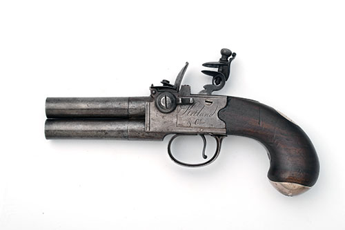 circa 1783, with round turn-off 2 1/2in. barrels (frozen), false rifling at the muzzles, plain unadorned slab-sided action, the left side signed in script 'KETLAND & CO.', plain hinged tap, central hammer, the frizzen with detent retainer and safety operated by the trigger-guard bow, walnut bag-shaped butt with swollen pommel capped with a plain silver butt-cap with rear tail Birmingham hallmarked for 1783, large silver oval escutcheon engraved with a 'WC' monogram above the place name 'ROBERTTOWN', guarded trigger and London proofs