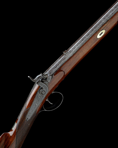 circa 1850, with browned octagonal multi-groove rifled 30in. barrel, the top-flat signed 'W. POWELL', bead fore-sight, standing notch dove-tailed rear-sight with additional folding leaf, scroll engraved colour hardened breech-block with single platinum line, long borderline and scroll engraved top-tang, border and scroll engraved back-action lock signed 'W. POWELL', en-suite dolphin-headed hammer, walnut half-stock chequered at the wrist, iron furniture retaining a good amount of original blued finish, nickel-silver fore-end tip and barrel-key escutcheons (missing fore-end barrel-loop and ramrod); COMPLETE WITH its original mahogany case, lined and compartmented in red velvet and containing a period loading mallet, scissors ball-mould, bag-shaped powder flask and cap-tin.