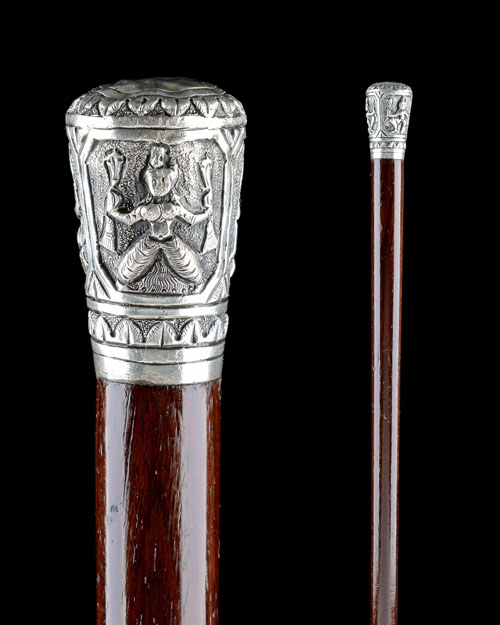 circa 1920, probably Indian in origin, with plain malacca 32 3/4in. shaft fitted with a heavy white-metal pommel relief embossed with border decoration and Indian deities, 34 3/4in. overall