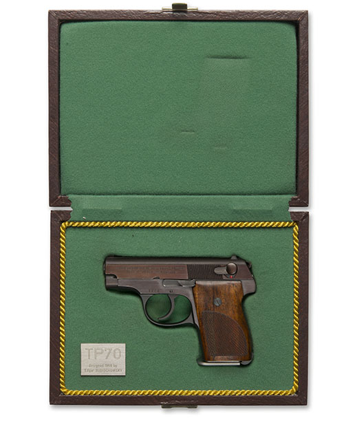 for 1973, with brushed bright 2 1/2in. barrel, blued, sighted slide, the left side marked 'BUDISCHOWSKY-WAFFEN GMBH ULM/DO MOD TP70 CAL 22 LONG RIFLE' slide mounted safe, exposed ring hammer, blued frame, chequered walnut grips, heel magazine release with stainless-steel magazine, the whole appearing little used, TOGETHER WITH its manufacturers brown leatherette covered hinged presentation case, lined and compartmented in green material with a yellow rope-twist border, the tray bearing an engraved plate with 'TP70 DESIGNED 1968 BY EDGAR BUDISCHOWSKY'