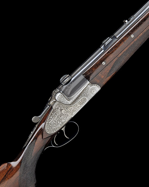 25 1/2in. nitro reproved (in 2016, partially struck off) combination barrels, serial numbered 4293.2, with raised solid matt top-rib, folding open sights, the breech end mounted with a Hensoldt Diavari-D 1,5-6x telescopic sight in quickly-detachable mounts, 2 3/4in. shot chamber, bored approx. 3/4 choke, quadruple-grip action with side-bolsters, automatic safety, set front trigger, bold Germanic scroll engraving, the decorative sideplates with game scenes of roe deer, duck and red deer, old silver finish, 14 5/8in. figured pistolgrip stock with cheekpiece, pistolgrip-cap, sling swivels and including 1in. ventilated rubber recoil pad, weight 7lb. 3oz. (shot barrels) and 8lb. 13oz. (combination barrels with scope), in a fitted leather case with provision for both sets of barrels and telescopic sight