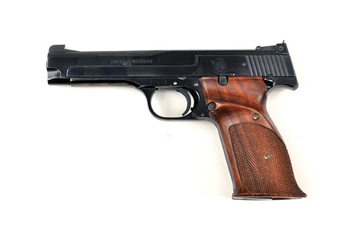 A .22 (L/R) SEMI-AUTOMATIC TARGET-PISTOL SIGNED SMITH & WESSON, MODEL '41', serial no. 71678, with blued sighted 5in. bull-barrel, blued slide and frame and chequered walnut grips (small chip at heel), retaining much original factory blued finish