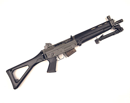 A .223 (REM) SEMI-AUTOMATIC RIFLE SIGNED SIG, MODEL '551', serial no. SG411297 with 14in. barrel including flash-hider, folding bipod, two position only selector, abs plastic furniture, folding stock and semi transparent short magazine