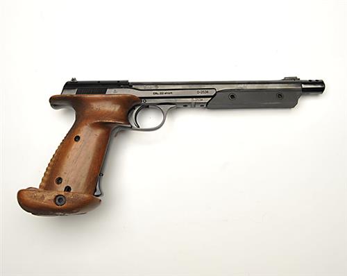 A .22 (SHORT) SEMI-AUTO PISTOL SIGNED HAMMERLI, MODEL OLYMPIA 200, serial no. 0-2534, with 8 1/8in. sighted barrel including muzzle-break, detachable under-barrel weight, blued alloy slide (missing extractor-claw) and chequered anatomical right hand walnut grip