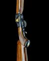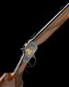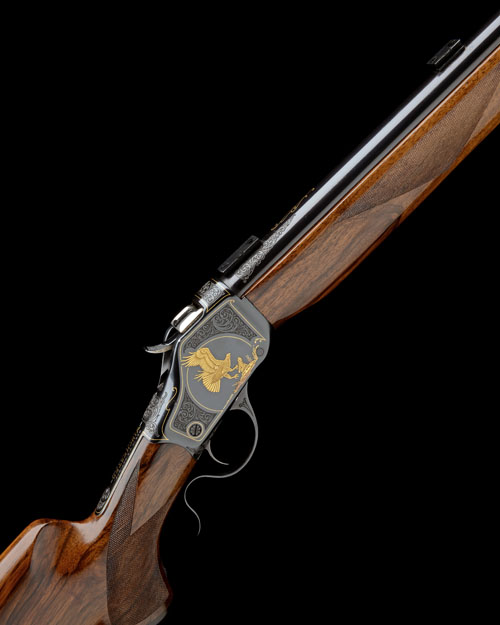 26in. heavy unsighted nitro reproved barrel with gold detailing at the muzzle and breech ends, the left side stamped 'KEN EYSTER HERITAGE GUNSMITHS 225 WINCHESTER', and with telescopic sight mount rails, black action carved in relief with acanthus scrollwork and with central vignettes of wildlife, carved in relief and inlaid in gold, the left side with a pair of beavers, on the right a bird of prey attacking a gopher, the top tang with 'REG IN US PAT OFF. TRADE MARK' and central gold-inlaid 'WINCHESTER' detail, the triggerguard tang gold-inlaid with the serial number, beavertail fore-end, 14in. pistolgrip stock with cheekpiece, sling eyes and chequered steel buttplate, weight 8lb. 15oz.