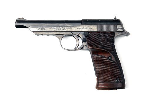 A .22LR SEMI-AUTOMATIC SPORT PISTOL SIGNED WALTHER "OLYMPIA", serial no. 9055 with 4 3/4 in. exposed blued barrel,slide and iron frame all retaining a good amount of original blue, with chequered walnut factory grips with slight thumb shelf to left hand grip