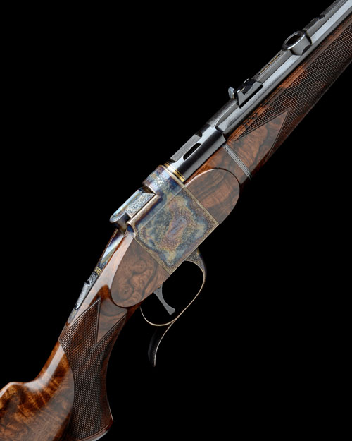 25 1/2in. nitro octagonal to round .22-250 Rem barrel, integral rib with gold-lines at the breech and gold-inlaid 'MARTINI & HAGN - CRANBROOK BC CANADA', matted sight rib gold-inlaid with the calibre designation and with open sights with folding leaf sight, ramp-mounted bead fore-sight the breech end mounted with a Zeiss Diatal-Z 4x32 T* telescopic sight in quickly-detachable mounts, fore-end with flat-top chequering and horn finial;