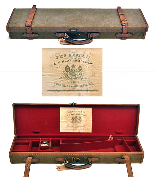 fitted for a 26in. barrel, the interior lined with red baize, a John Rigby & Co. trade label, brass lock (key missing)