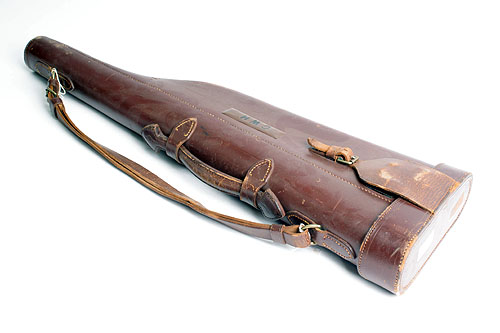 A LEATHER LEG-OF-MUTTON SINGLE GUNCASE, suitable for 29in. barrels, the interior lined with green baize, the exterior with the monogram 'C.W.H.'