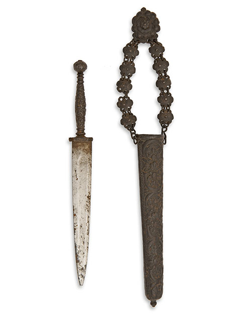 A 17TH CENTURY IRON-MOUNTED DAGGER AND SCABBARD,
