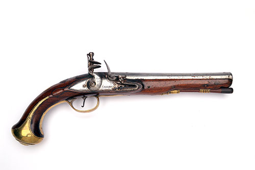circa 1745, with swamped iron 8in. brushed bright barrel, borderline engraved sighting plane at breech with tear-drop terminal, the top signed 'LONDON', london proofs and barrel-makers mark 'IB' surmounted with a crown for J. Brazier, solid border engraved top-tang, border engraved radiused lock with pointed tail signed 'FREEMAN' forwards of the hammer, unbridled frizzen. walnut full-stock with rococo carved apron around the top-tang and dropper points, swollen pommel with long-eared brass butt-cap (grip broken through and repaired), brass furniture including pierced and engraved border side-plate, shaped escutcheon at wrist engraved with a unicorn above a wreath and 'No1', horn tipped wood rammer (frozen)