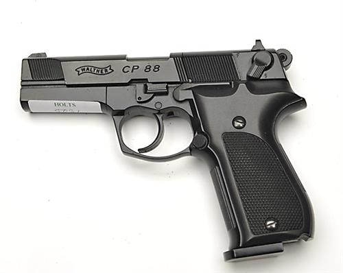 A CASED .177 CO2 POWERED REPEATING AIR-PISTOL SIGNED WALTHER, MODEL 'CP88', serial no. A90369987, with 4in. barrel, rotary magazine, blued slide and frame, black plastic chequered grips COMPLETE WITH its makers abs plastic carry-case and a cleaning brush