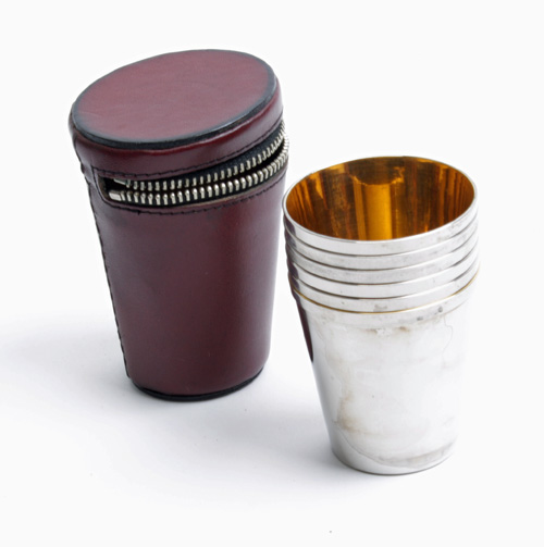 A SET OF SIX CASED STAINLESS STEEL DRINKING CUPS, with leather zip case