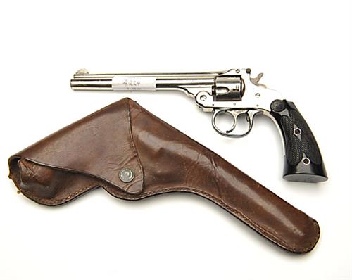 A .32 (S&W) FIVE-SHOT REVOLVER SIGNED HARRINGTON & RICHARDSON, serial no. 897, circa 1898, with nickel-plated 6in. barrel, plated break-open frame and fluted cylinder, black hard-rubber chequered grips, appearing little used, TOGETHER WITH a period leather full-flap holster