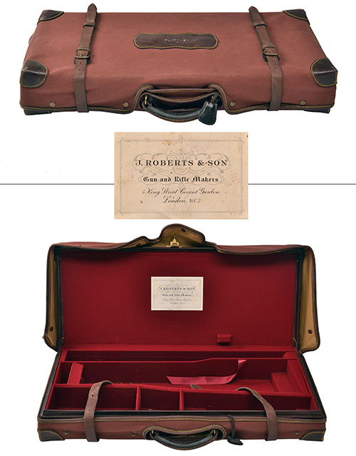 fitted for 25 1/2in. barrels, the interior lined with red baize, a J. Roberts & Son trade label, brass lock (key missing), maroon canvas and leather outer
