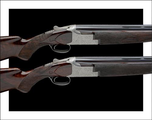 actions with hold-open toplevers gold-inlaid '1' and '2', manual safeties with integral barrel selector switches and gold-inlaid 'S', 'O' and 'U' details, fine stylised acanthus and floral engraving on a matted background, signed 'A. CUISSET', and with the model designation, bright finish, 15 1/4in. well-figured pistolgrip stocks (small crack at hand No.2), No.1 weight 7lb. 7oz. (I barrels) and 7lb. 6oz. (II barrels), No.2 weight 7lb. 4oz. (I barrels) and 7lb. 6oz. (II barrels), in their individual fleece-lined leather slips with provision for extra barrels
