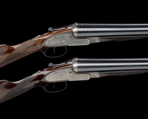 28in. nitro barrels, ribs engraved 'WILLIAM POWELL & SON (GUNMAKERS) LTD. 35 CARR'S LANE. BIRMINGHAM.', and gold-inlaid '1' and '2', 2 1/2in. chambers, bored approx. imp. cyl. and 1/2 choke, toplevers gold-inlaid '1' and '2', automatic safeties with gold-inlaid 'SAFE' details, border engraving, retaining some original colour-hardening, locks and furniture swept, 15in. stocks cast for central vision, No.2 a replacement, weight 6lb. 7oz. (No.1) and 6lb. 9oz. (No.2), in their leather motor case