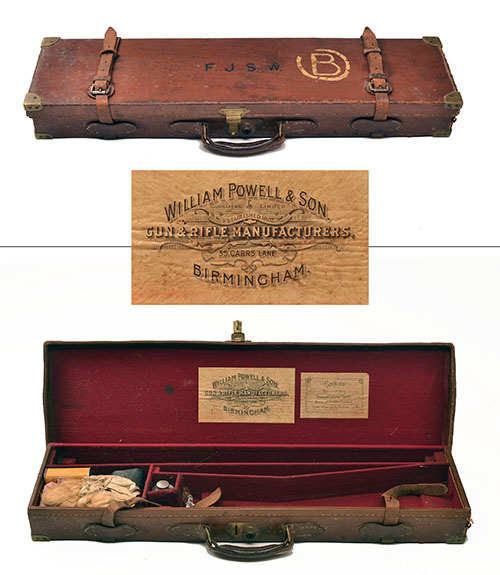 fitted for 28in. barrels, the interior lined with maroon baize, a William Powell & Son trade label, brass lock (key missing) the lid exterior with 'F.J.S.W.'