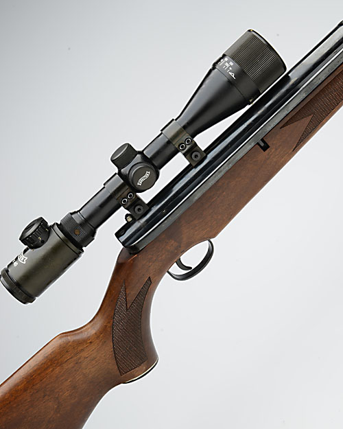 A .22 SIDE-LEVER COCKING AIR-RIFLE SIGNED WEBLEY & SCOTT, MODEL 'TRACKER DELUXE', serial no. 40956, circa 1985, with 11 1/2in. barrel including built-on muzzle weight, blued air-chamber, lift up loading tap, chequered walnut half-stock and FITTED WITH a Walther 3-9x40 P/A I/R telescopic sight