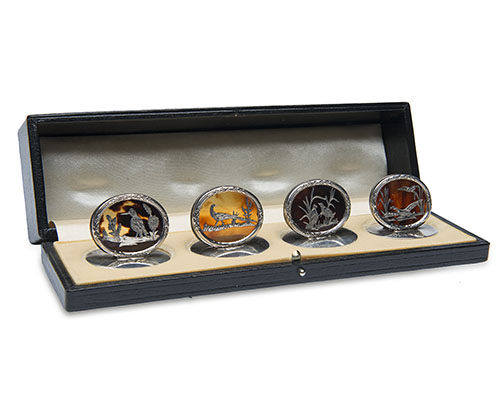 London hallmarks for 1921, each oval in design, tortoiseshell interior inlaid with intricate silver game birds, contained within original fitted case